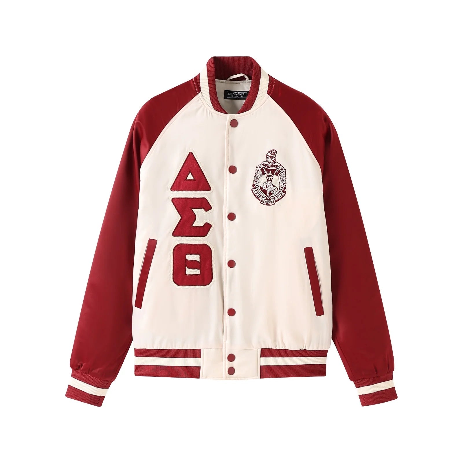 Show your Delta pride in style with the Delta Cream Bomber Jacket. Made from smooth satin material, this jacket combines elegance with functionality. The 100-gram quilted lining provides warmth without bulk, while the embroidered logos give a bold, lasting statement of Greek tradition.