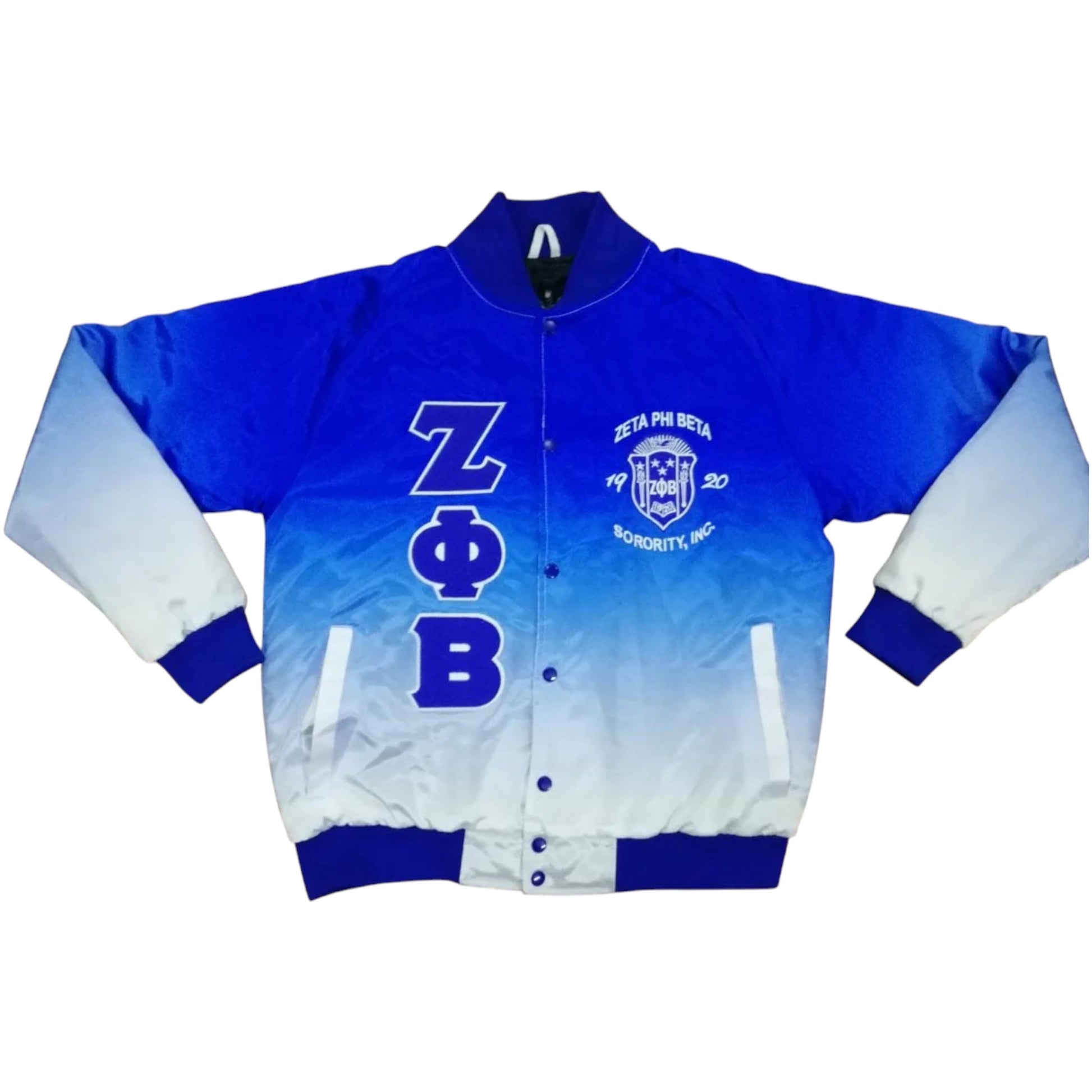 The Zeta Phi Beta Faded Bomber Jacket delivers bold style and comfort in a unisex fit. Featuring a Royal Blue fade to White, this jacket is crafted from premium satin material and includes quilted lining, royal blue ribbing and buttons, embroidered logos, and a custom back embroidery, making it a statement piece for streetwear and casual looks.